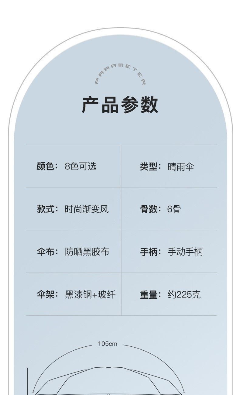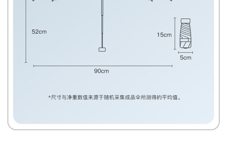 规格:51cm*6骨 重量:225g 伞骨材质:黑钢骨架+纤维 伞布材质:黑胶 卖点:小巧便携