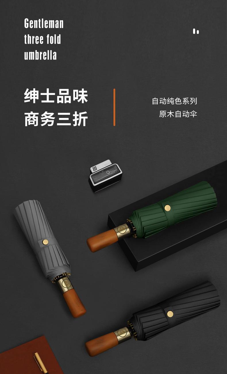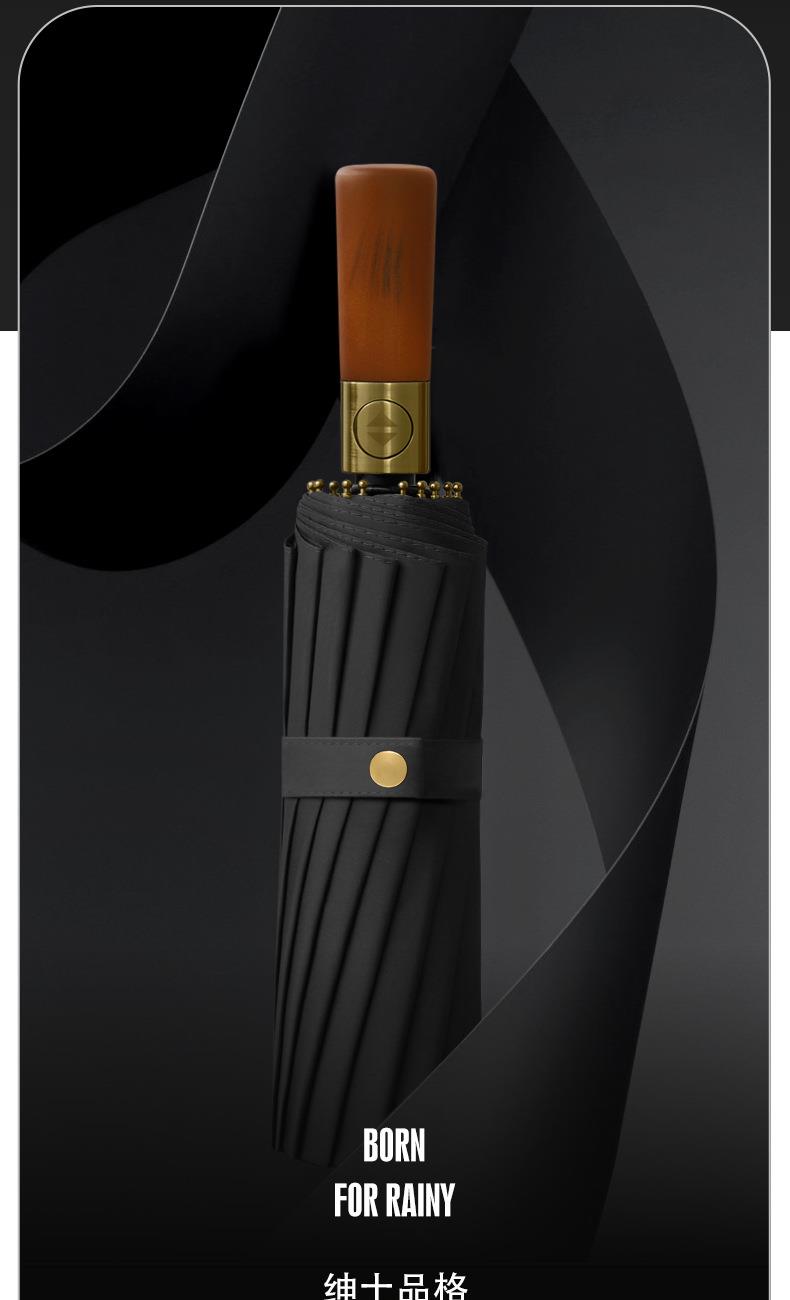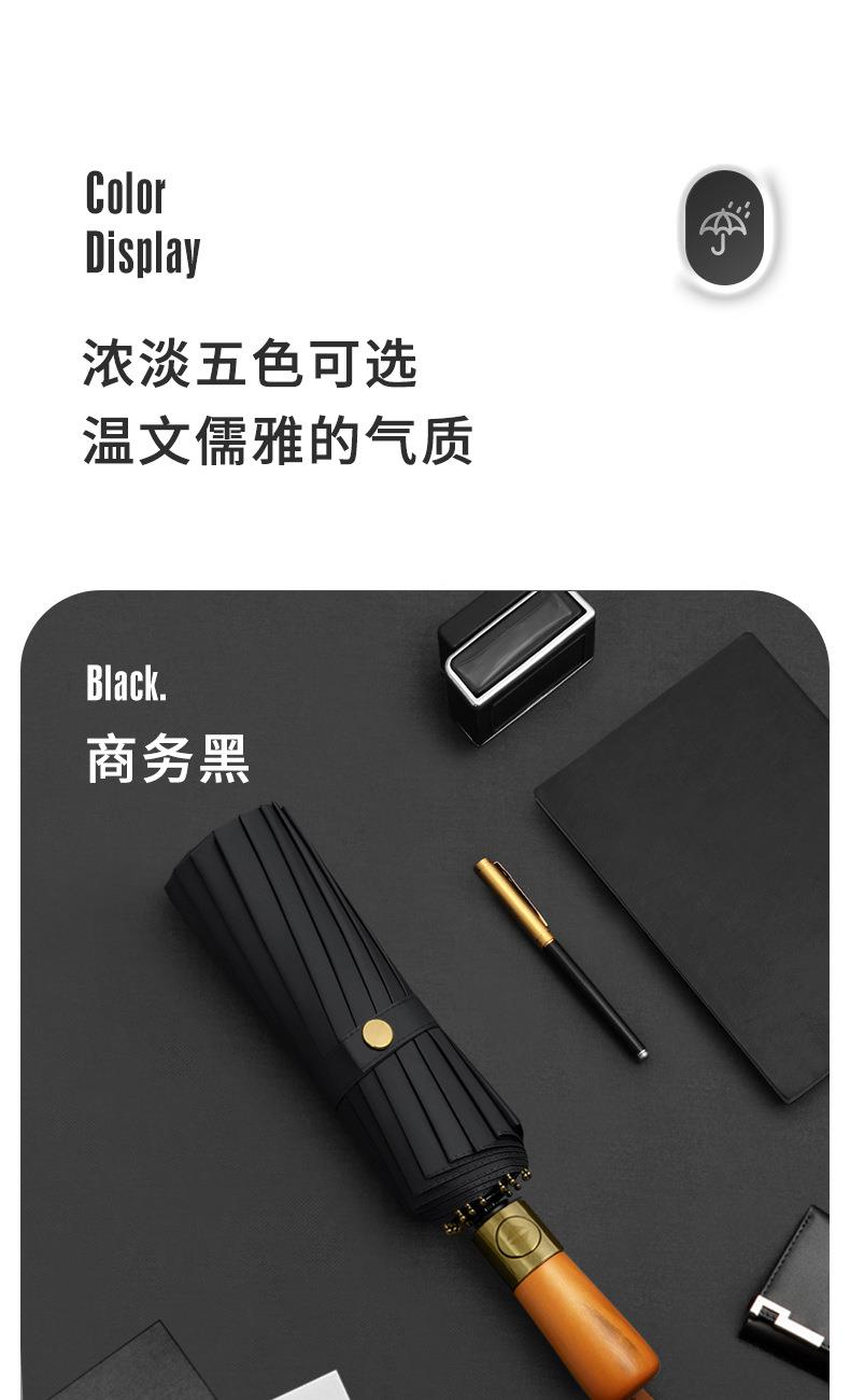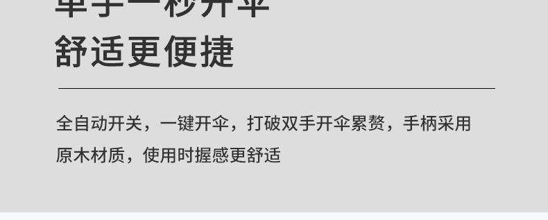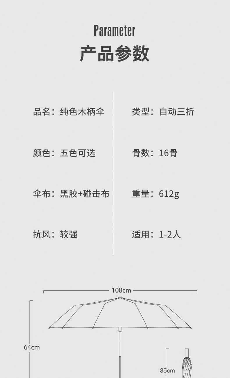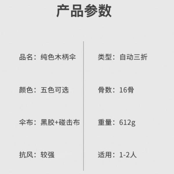 品名:全自动16骨原木手柄男商务晴雨伞 颜色:五色可选 伞布:黑胶+碰击布 抗风:较强 类型:自动三折 骨数:16骨 重量:612g 适用:1-2人
