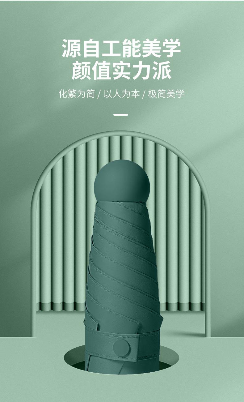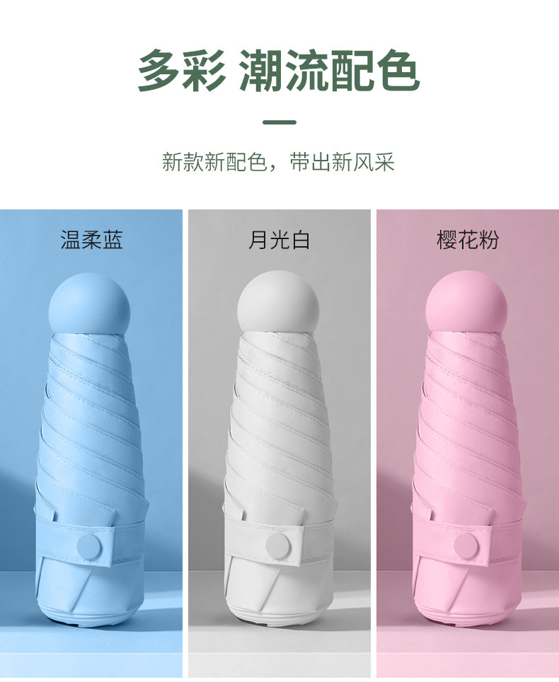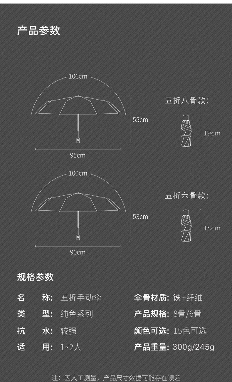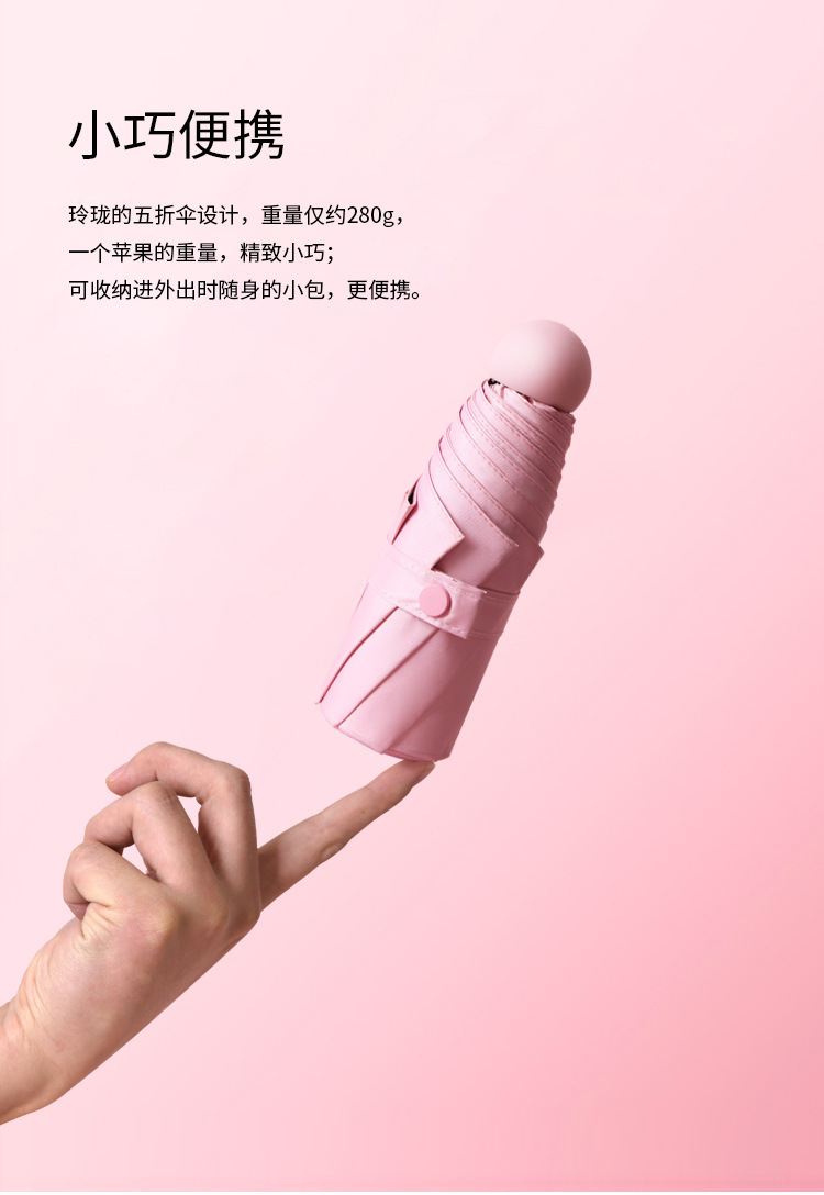 款式:五折伞(带胶囊盒子) 伞架:久合版超轻 伞面:190T黑胶布 (防紫外线) 手柄:PVC手感胶 尺寸:53厘米 X 6K