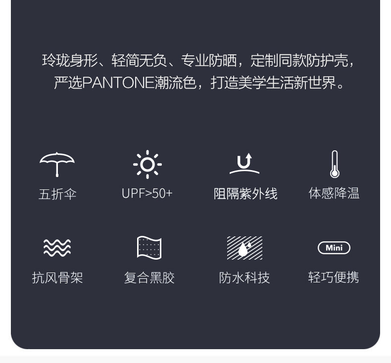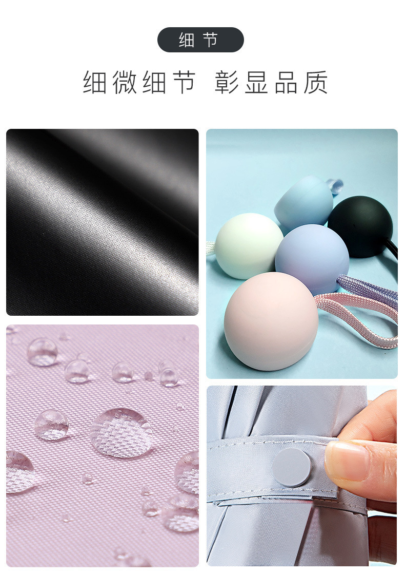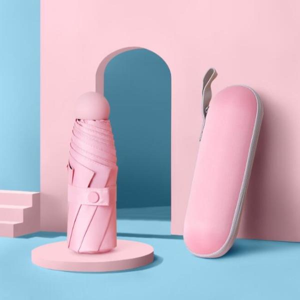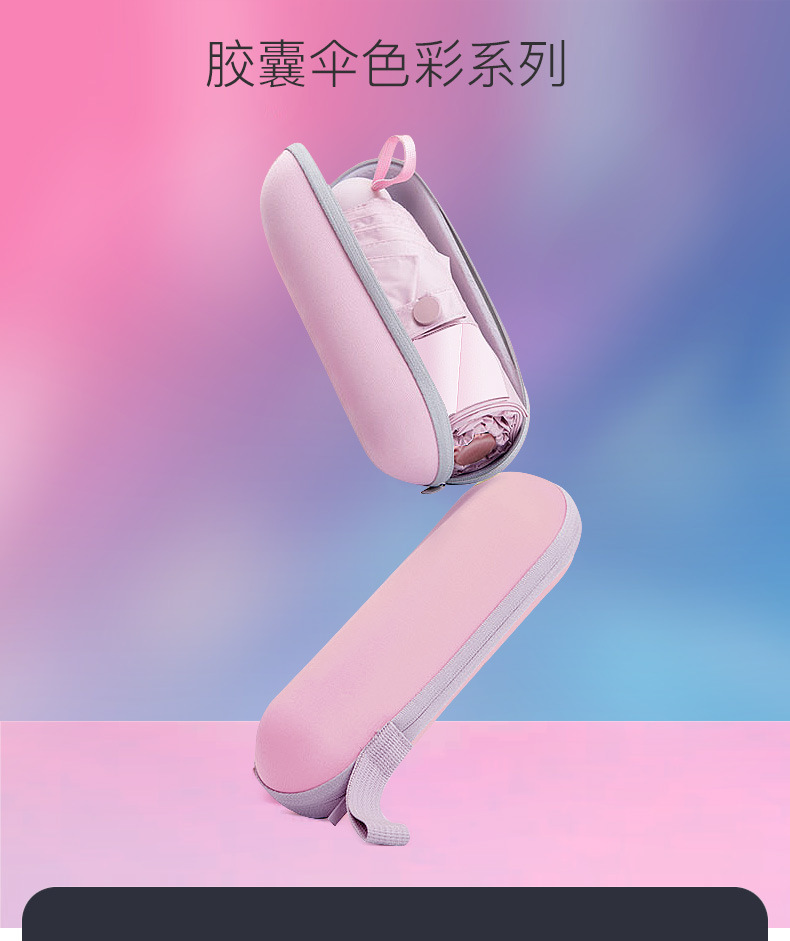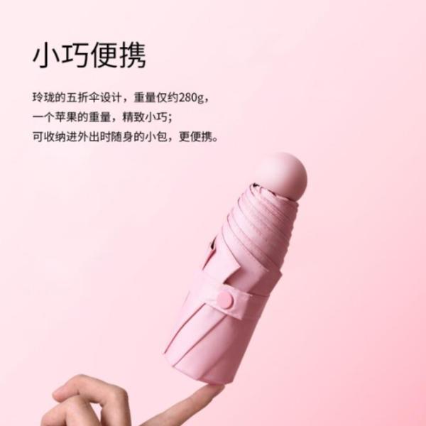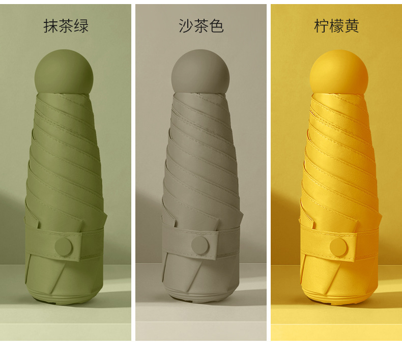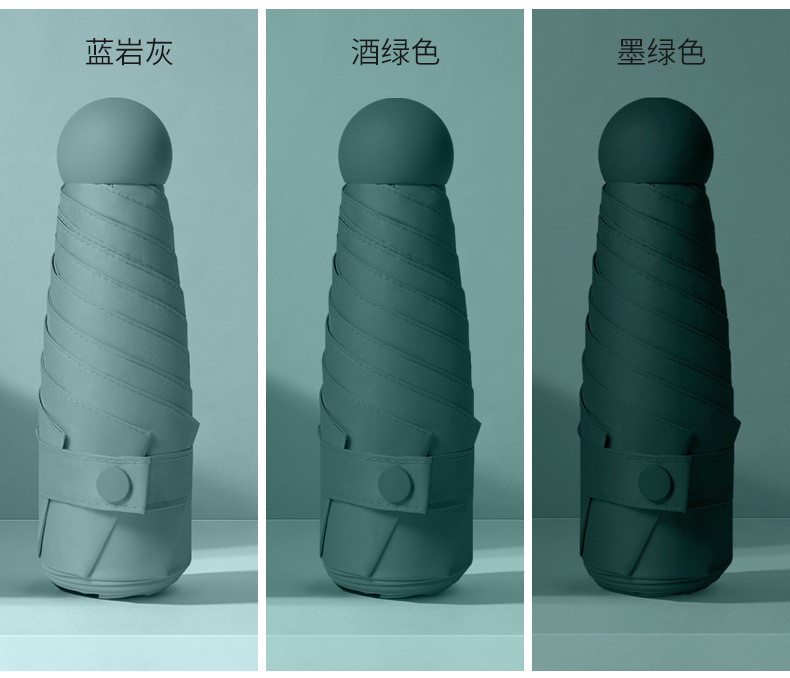 款式:五折伞(带胶囊盒子) 伞架:久合版超轻 伞面:190T黑胶布 (防紫外线) 手柄:PVC手感胶 尺寸:53厘米 X 6K
