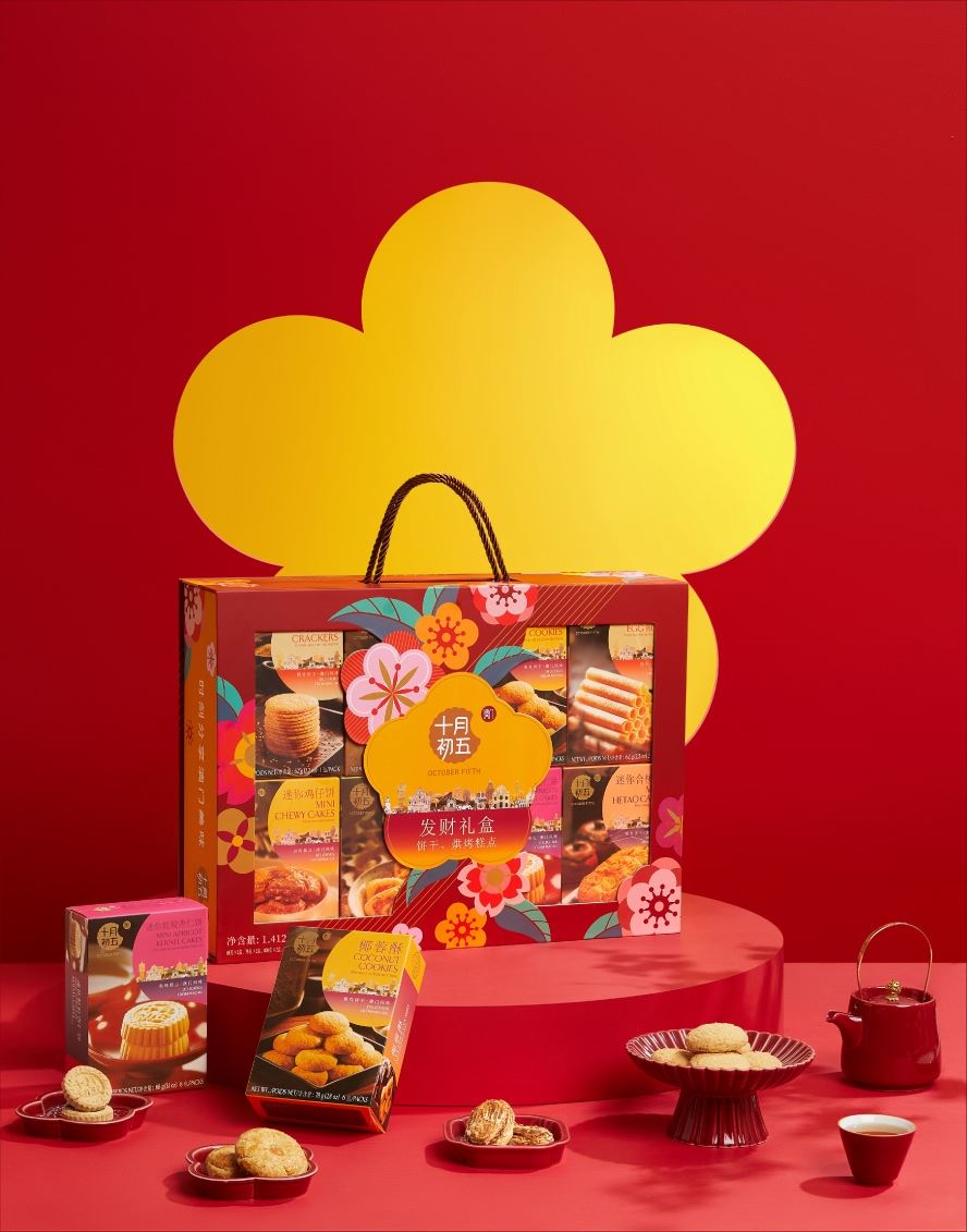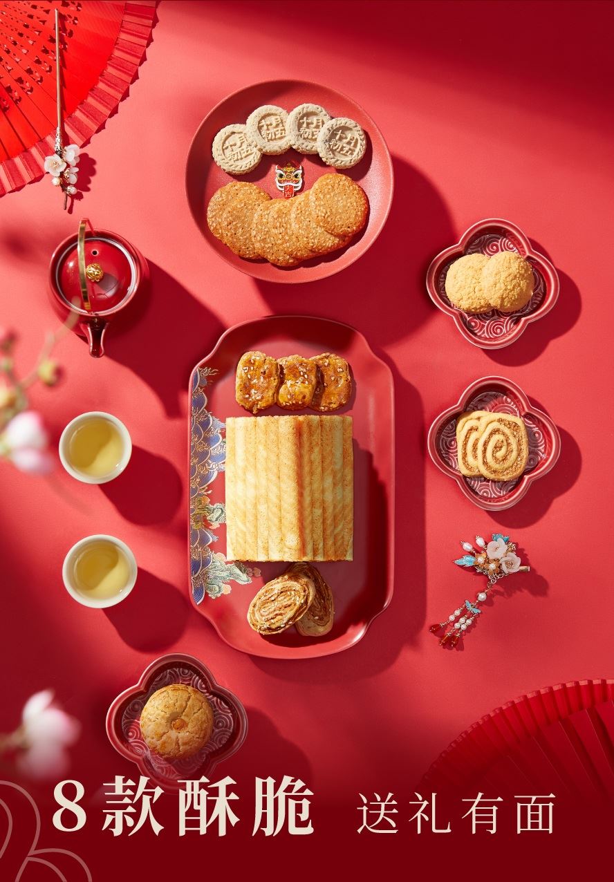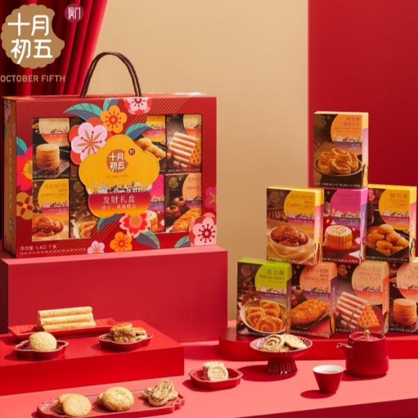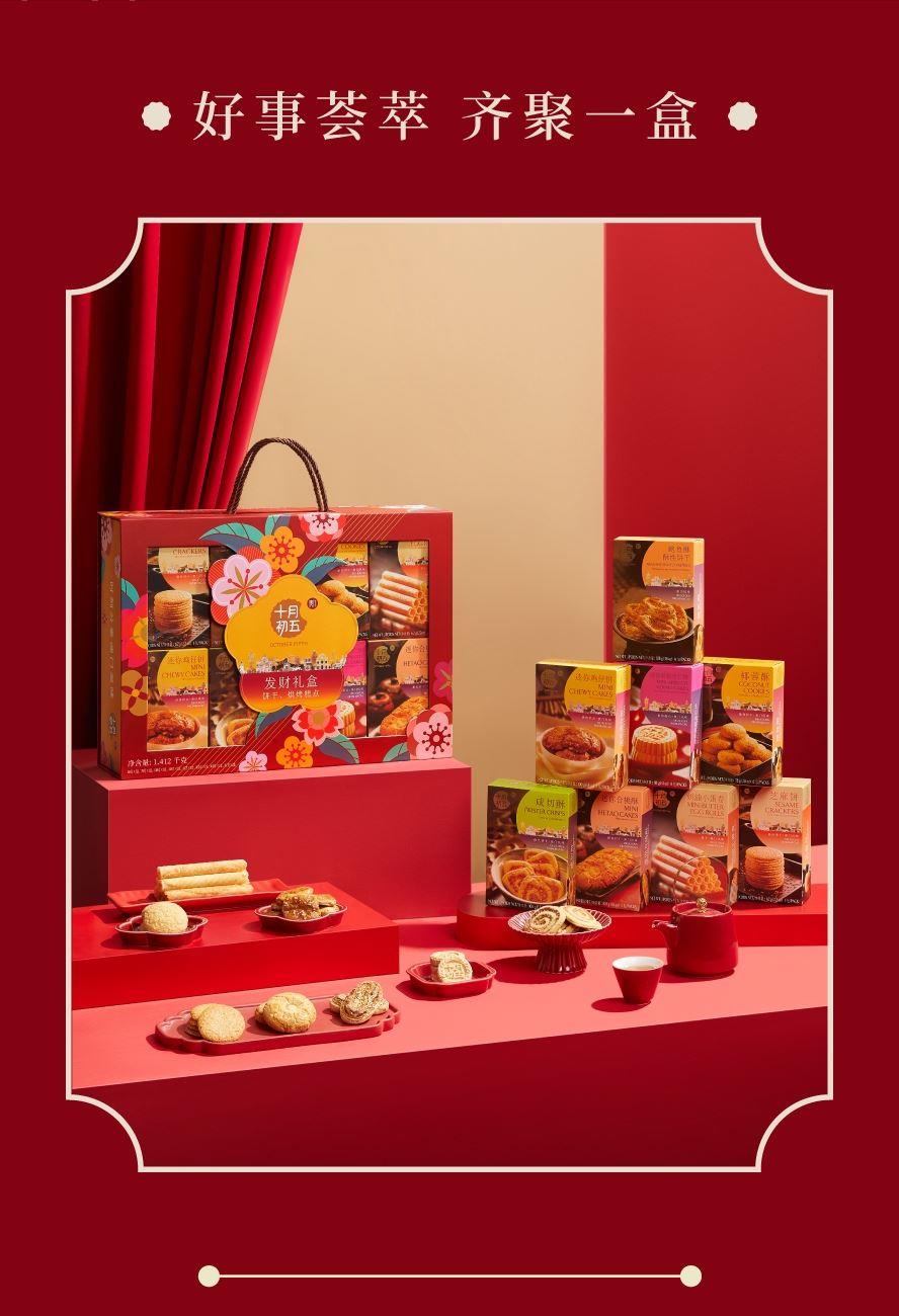十月初五发财礼盒 净含量:1412g 88g迷你粒粒杏仁饼X2盒 108g迷你合桃酥X2盒 108g鲍鱼酥X2盒 62g芝麻饼X2盒 78g椰蓉酥X2盒 100g迷你鸡仔饼X2盒 100g咸切酥X2盒 62g奶油小蛋卷X2盒