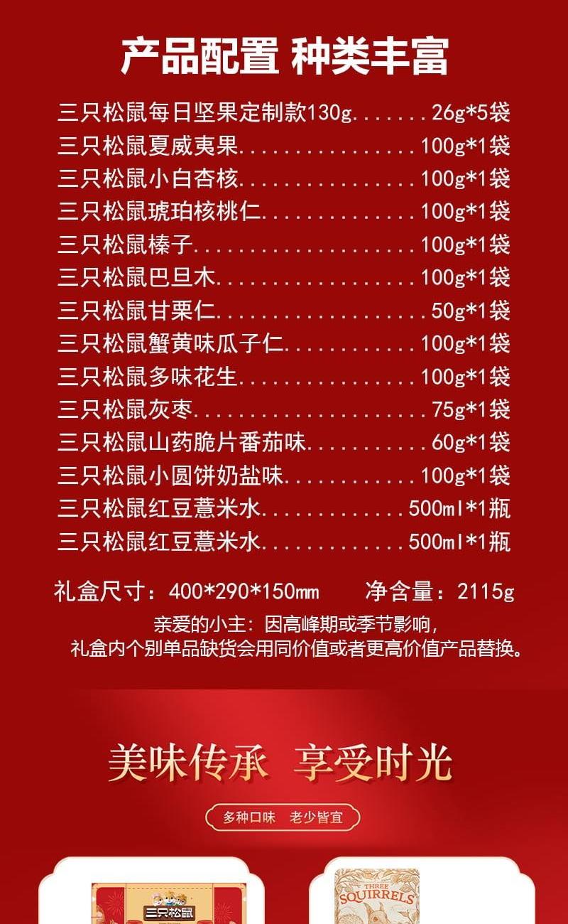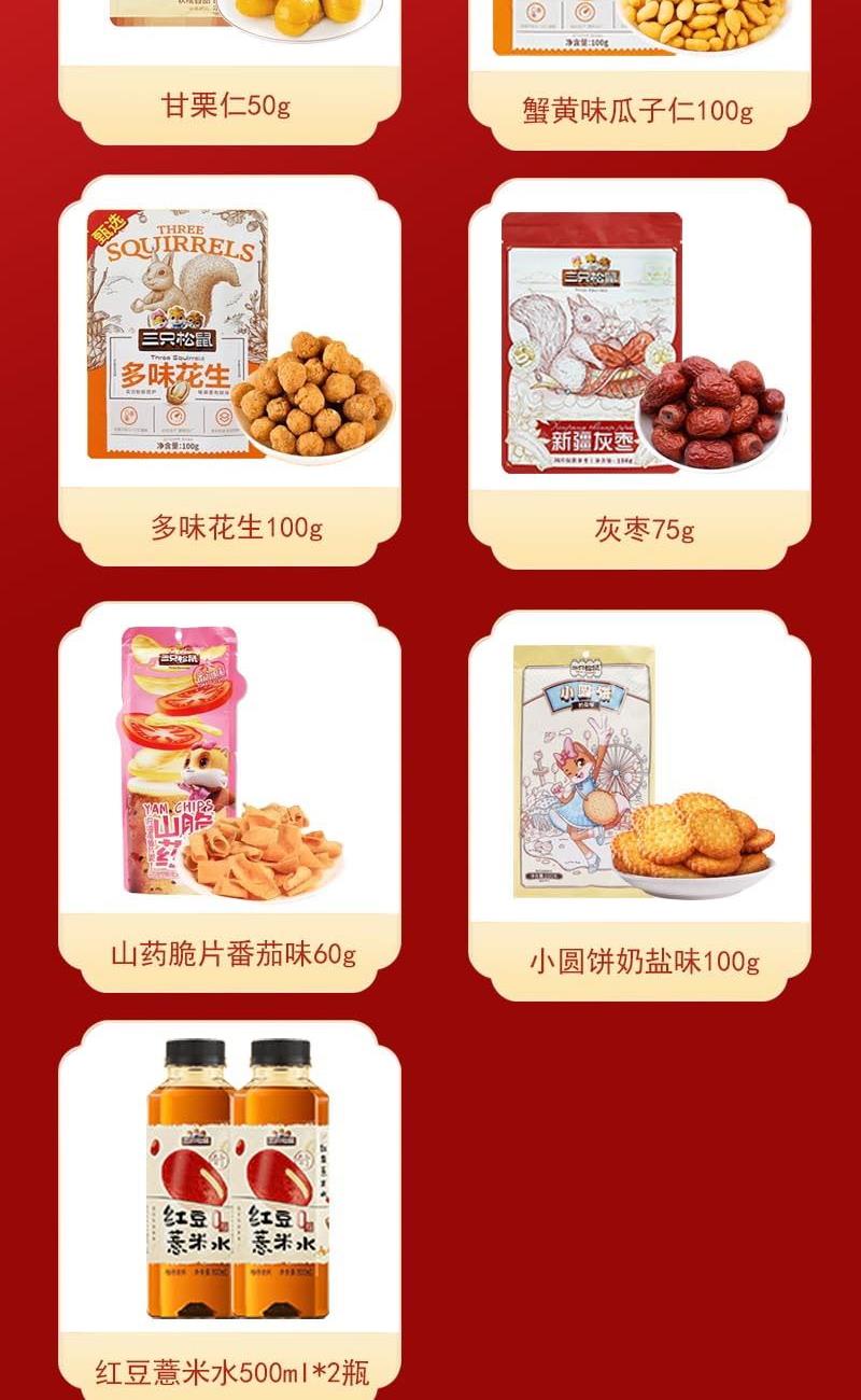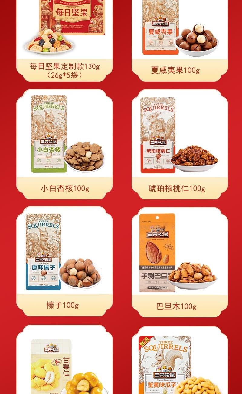三只松鼠每日坚果定制款130g(26g*5袋) 三只松鼠夏威夷果100g 三只松鼠小白杏核100g 三只松鼠琥珀核桃仁100g 三只松鼠榛子100g 三只松鼠巴旦木100g 三只松鼠甘栗仁50g 三只松鼠蟹黄味瓜子仁100g 三只松鼠多味花生100g 三只松鼠灰枣75g 三只松鼠山药脆片番茄味60g 三只松鼠小圆饼奶盐味100g 三只松鼠红豆薏米水500ml 三只松鼠红豆薏米水500ml