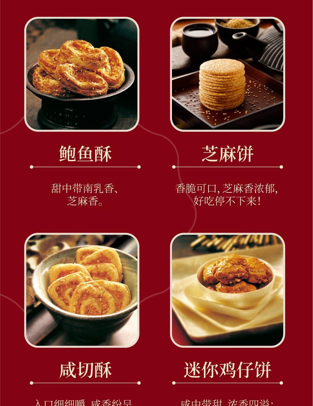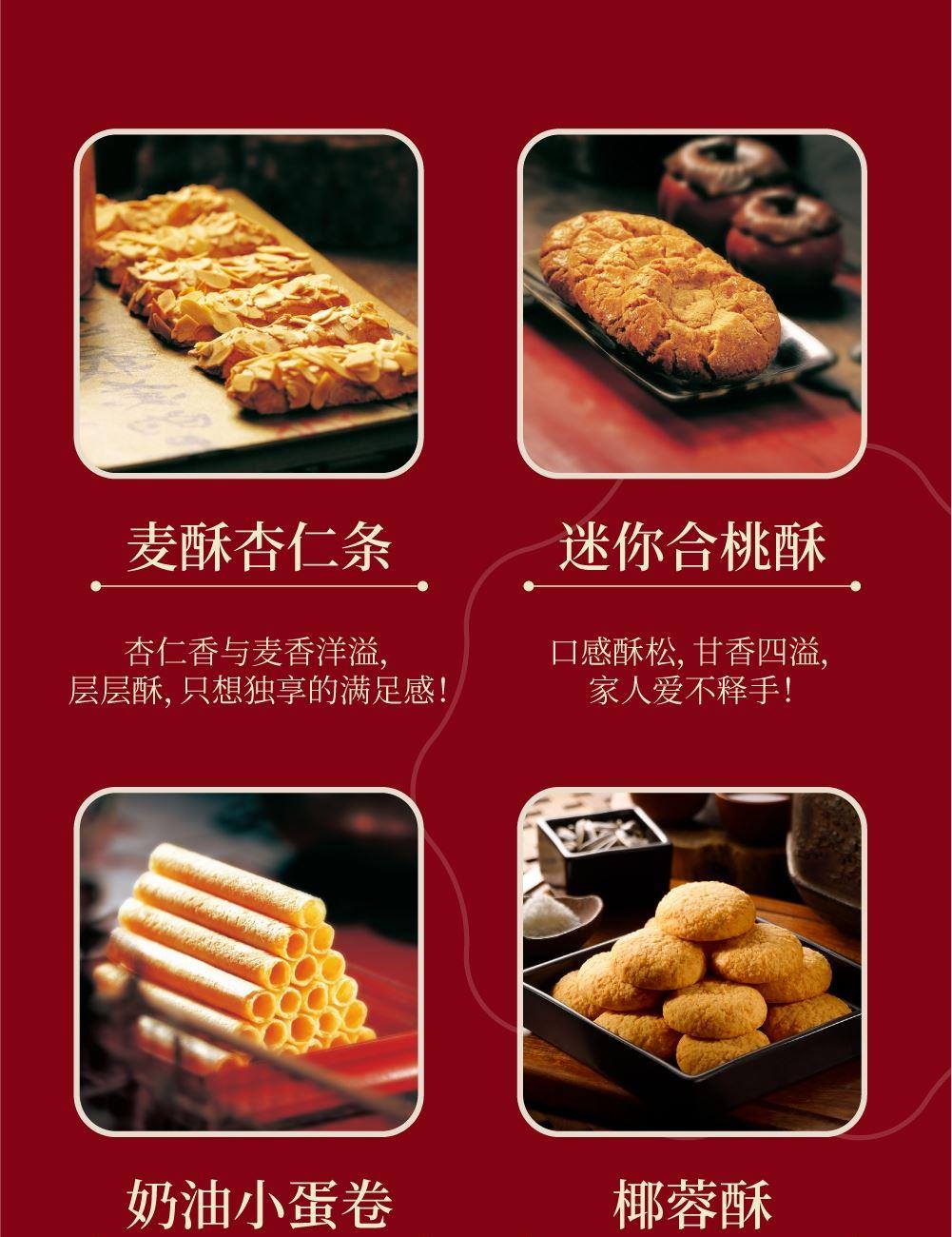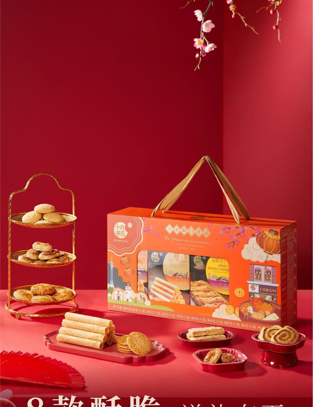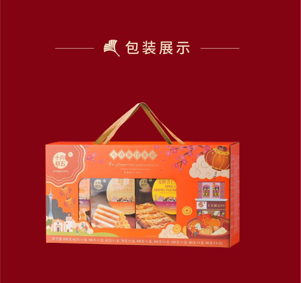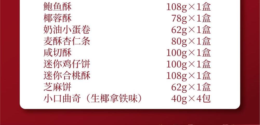 十月初五八喜临门礼盒 净含量:858g 80g麦酥杏仁条X1盒 78g椰蓉酥X1盒 62g芝麻饼X1盒 62g奶油小蛋卷X1盒 108g迷你合桃酥X1盒 108g鲍鱼酥X1盒 100g咸切酥X1盒 100g迷你鸡仔饼X1盒 40g小口曲奇(生椰拿铁味)X4包