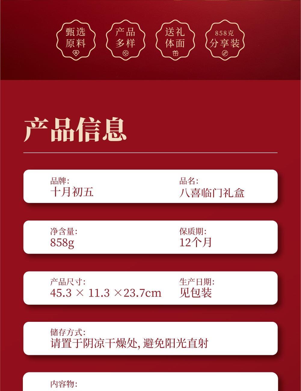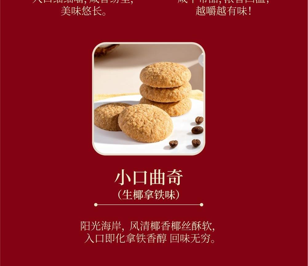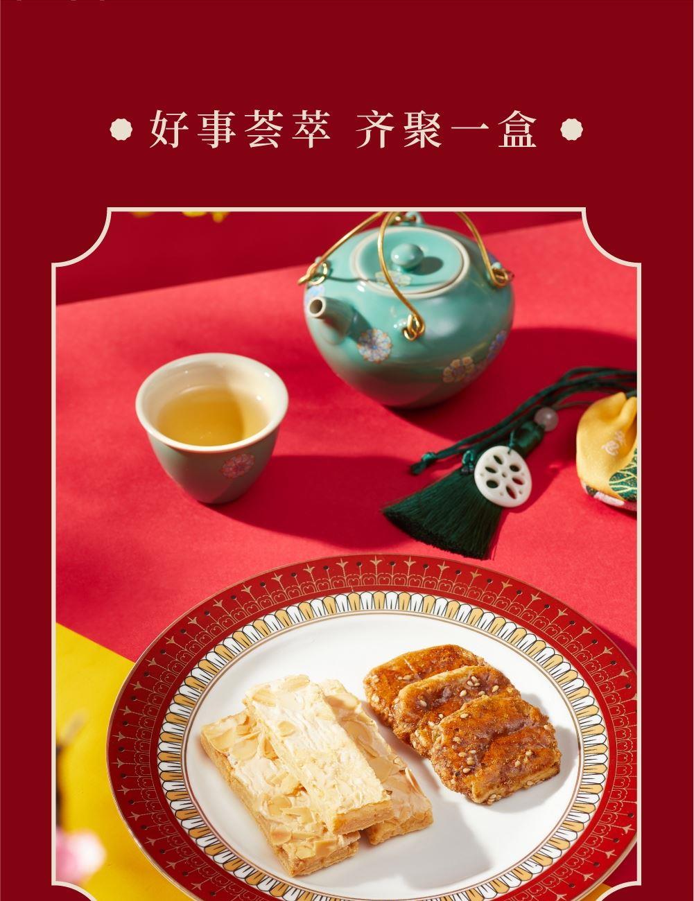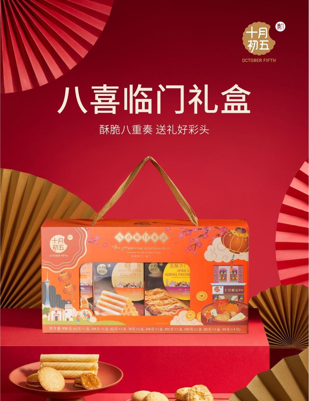 十月初五八喜临门礼盒 净含量:858g 80g麦酥杏仁条X1盒 78g椰蓉酥X1盒 62g芝麻饼X1盒 62g奶油小蛋卷X1盒 108g迷你合桃酥X1盒 108g鲍鱼酥X1盒 100g咸切酥X1盒 100g迷你鸡仔饼X1盒 40g小口曲奇(生椰拿铁味)X4包