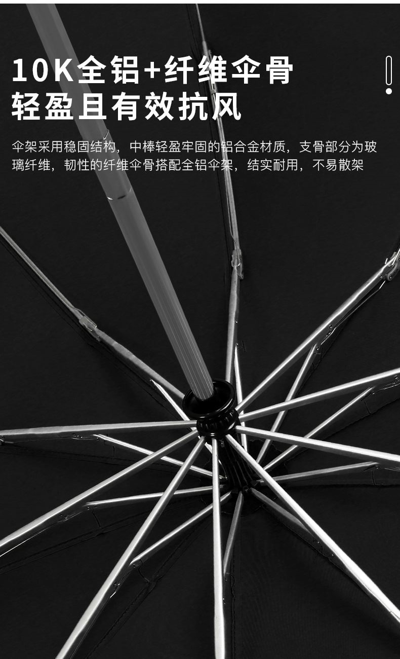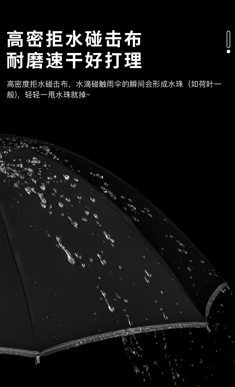 产品规格:57cm*10骨 产品重量:447g 伞骨材质:铝合金+纤维谷 伞布材质:230T碰起布 卖点 单手开收,上下车不湿身 简约时尚朴素,选用高密度碰击布,大颗粒雨滴犹如荷叶般滑落,一触即落,晴雨无忧,10根优质纤维骨架,超强抗风,精致花型伞帽,优质同色系魔术贴伞带,手感舒适的雅致原木手柄。